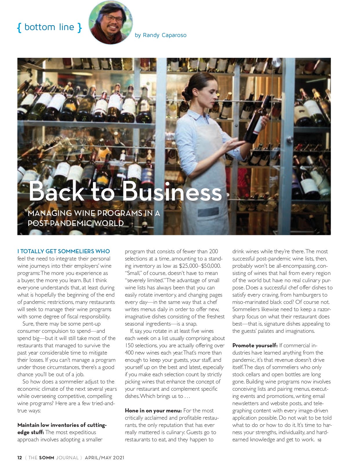 Although it’s been over four years since this one-pager, “Back to business (managing wine programs in a post-pandemic world),” was published in The SOMM Journal, it has recently occurred to me that not only are we are still living in the same world, it’s gotten worse.